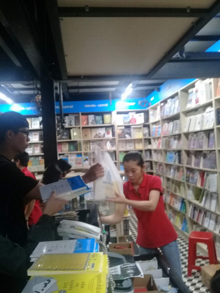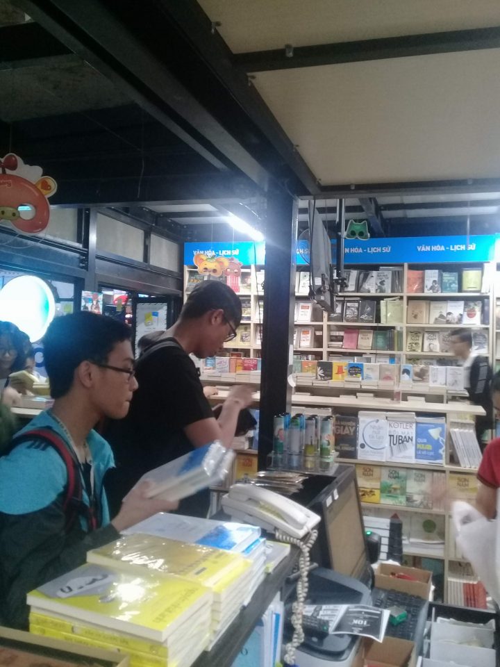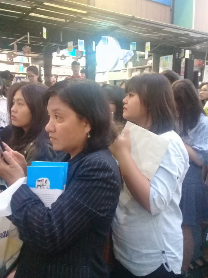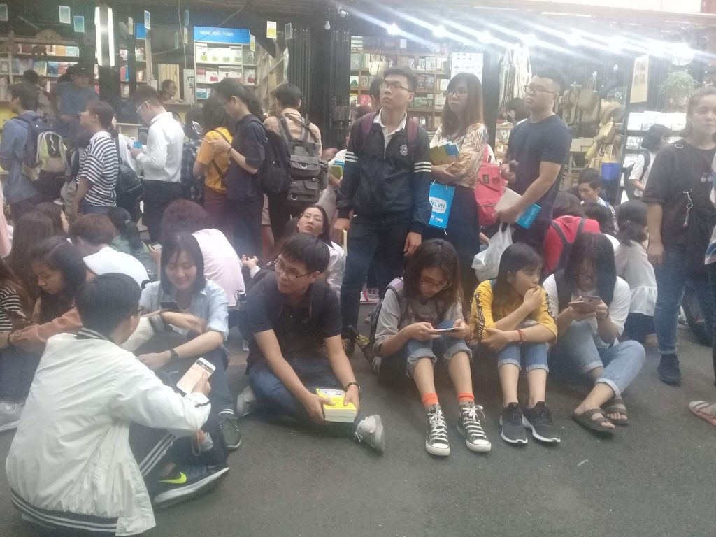 10h16, không khí tại buổi ký tặng vẫn rất náo nhiệt, nhiều bạn trẻ vẫn xếp hàng mặc dù không còn phiếu ký tặng. Một số bạn trẻ ngồi xuống vì xếp hàng trong thời gian dài.